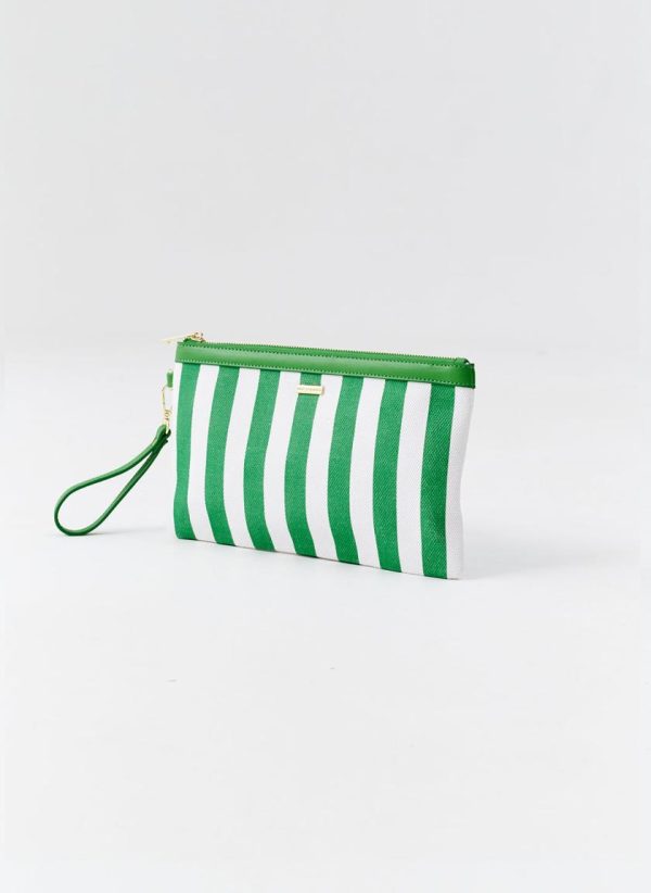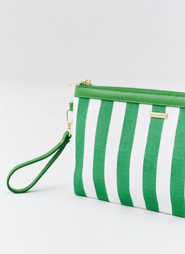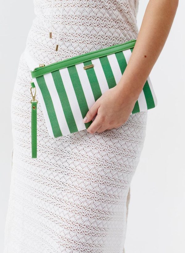 Versatile and practical, add to your holiday accessories with the Capri Clutch. In cheerful Green Nautical stripes, this stylish pouch is an easy piece to take you from day-to-night. Crafted from canvas with leather trims, this slim design boasts a removable wrist strap, internal compartment, and a reliable zip fastening. A signature gold-tone branded plaque completes the look. Slip inside the Cap Ferrat Beach Tote to keep your valuables safe.