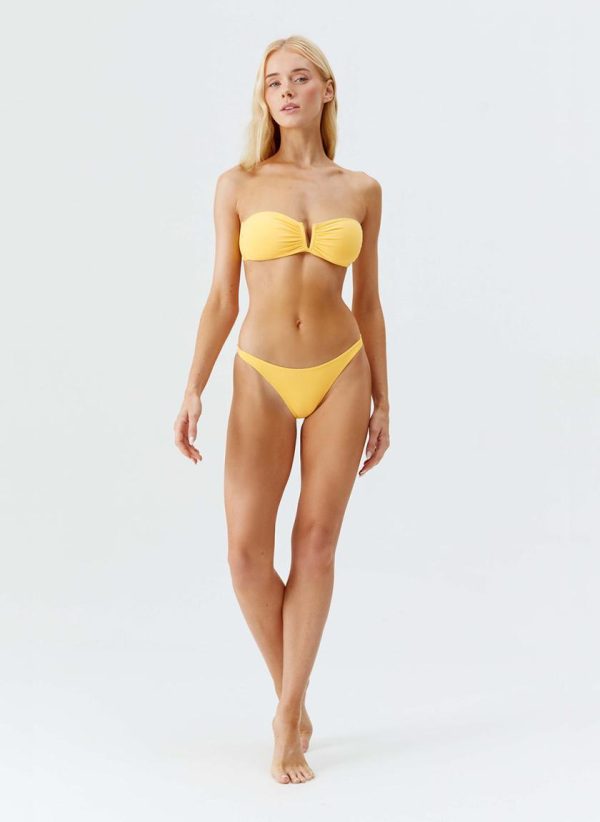 Channel a sunshine state of mind on your next beach getaway in the Alba Bikini Top. An Odabash staple, this laid-back silhouette is now available in a mood-boosting shade of Sunflower with SPF 50+ protection. The bandeau bikini top boasts removable pads, a ‘V’ neckline, subtle ruching at the bust and is finished with clasp fastening at the reverse. Complete the set with the matching hipster bottoms.