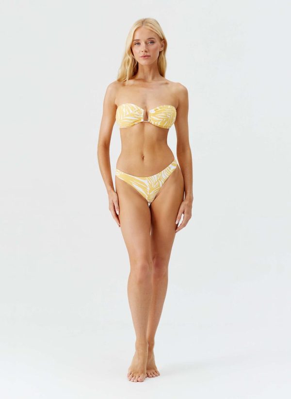 Relax and unwind on your next exotic getaway in the Barcelona Bikini Top. A staple in the wardrobe of many Odabash women, this iconic style has been updated for Cruise 2025 in our yellow and white Jungle print. The bandeau top ties at the back and features a luxe gold U trim at the centre of the bust. Pair with the matching hipster bottoms to complete the set.