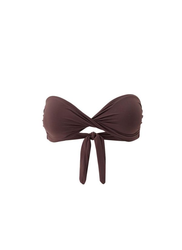 Modern yet timeless, update your swimwear contingent with the exclusive Martinique Bikini Top. In a rich shade of Brown, this set has been crafted from premium swim fabric with SPF 50+ protection. The bandeau top is enhanced with elegant, ruched detailing across the twisted cup design. Fastening with a tie-back, enabling a secure fit. Style with the matching bottoms.