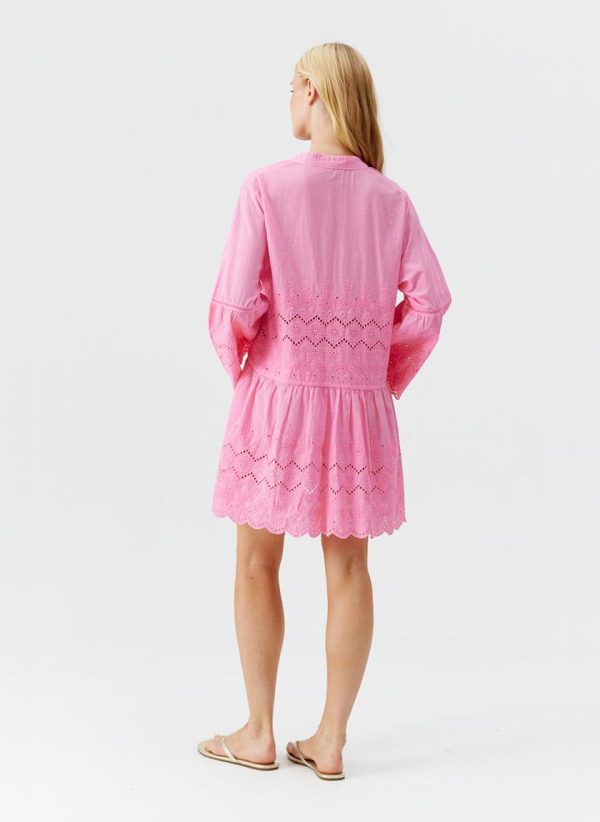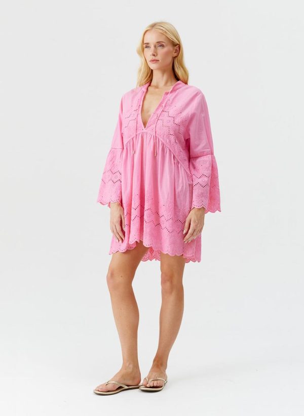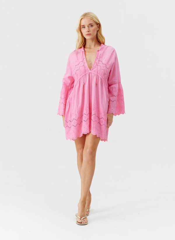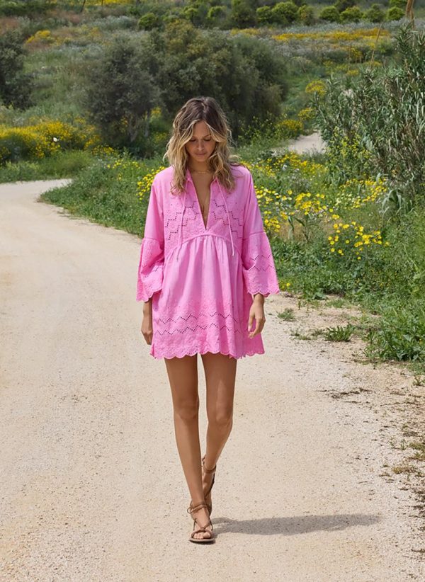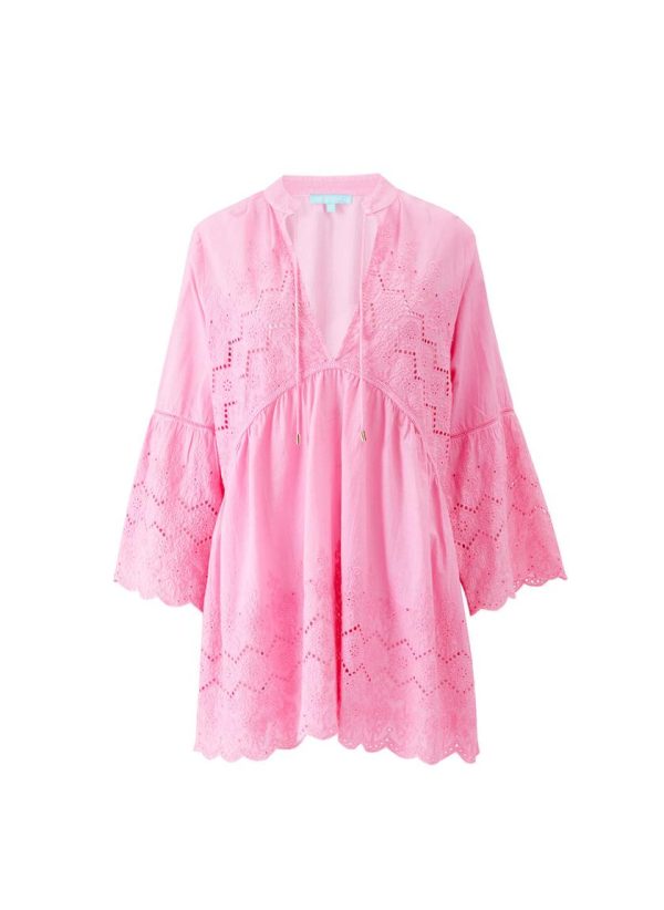 Introduce a vibrant burst of colour to your beachwear collection with the Sebena Kaftan. Pretty and romantic in Pink, this style is crafted from pure, premium cotton. The perfect beach cover-up, it falls to short, mini length with intricate crochet detailing throughout. Cut for a loose, relaxed fit, it features dramatic bell sleeves and ties at the neck, finished with our signature gold branded cord-ends.