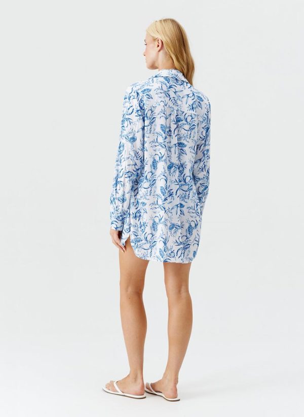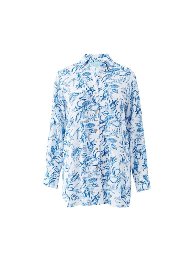 Add to your destination wardrobe with versatile pieces that give you multiple ways to wear like the Paige Shirt. Emblazoned in our hero Blue Leaf print of the Cruise 2025 collection, this style falls to mid-thigh. Cut for a loose fit, this piece boasts full length sleeves, a traditional shirt collar and button fastenings. Slip over your favourite Odabash swimwear or pair with Olivia trousers in the matching print for an effortless look for a day exploring the local town.