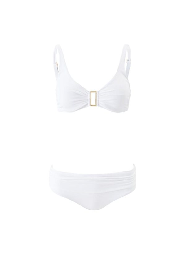 For an elegant addition to your swimwear collection, invest in the Bel Air Bikini. Crisp and cool in White, this iconic style is crafted from premium Italian swim fabric with underwired cups to provide support at the bust. Adding to the styles comfortability, it features adjustable over-the-shoulder straps and for a secure fit a clasp fastening at the back. The Bel Air is finished with a luxe golden rectangle at the centre of the chest. Matching bottoms offer full coverage with a flattering ruched panel.