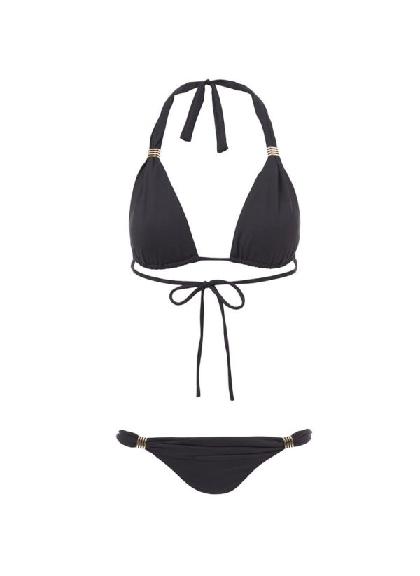 A timeless addition for your swimwear wardrobe, the Grenada Bikini in black is imbued with chic appeal lauded by the style elite. The halterneck top boasts removable pads, tying at the nape of the neck and back, while the bikini bottoms are cut with a hipster fit. Gold-toned slider trims on the bikini top and bikini bottoms deliver signature Odabash style. We recommend styling under the Victoria Kaftan in black also from the 2025 Core Collection.
