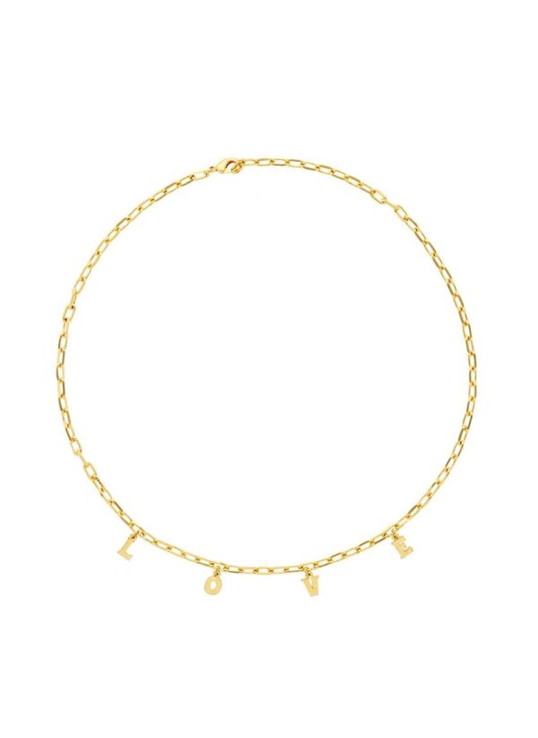 The Gold Chain LOVE necklace from Melissa Odabash’s new collection is designed with a simple chain and adorned with draping letters, a unique symbol of love. Suitable for stacking with your other necklaces or worn as a statement piece. Create a contemporary finish to your look with this on-trend style, match effortlessly with the new Gold Chunky Huggies.