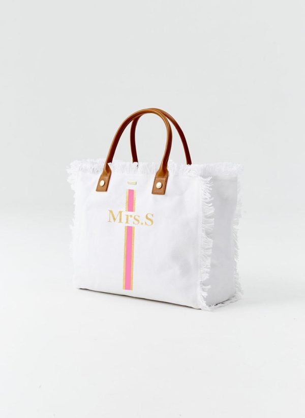 Experience unparalleled luxury with the Cap Ferrat Large Beach Tote in pristine white, featuring hand-painted pink and gold stripes, side by side. Painted with “MRS” and your choice of initial at the end, this personalised touch is meticulously crafted in the UK, ensuring a bespoke finish. With a zip compartment and extra pockets for organisation, along with sophisticated leather handles, this canvas bag offers both practicality and elegance. A perfect bridal shower, wedding, or honeymoon gift, it’s a stunning accessory for seaside retreats or romantic getaways.