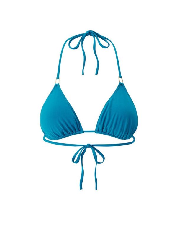 A contemporary take on a classic, add to your swimwear rotation with the Cancun Bikini Top. A much-loved silhouette we frequently return to, this style has been updated for Cruise 2025 in vibrant Teal. Crafted from luxe swim fabric, it offers SPF 50+ protection. Its triangle top features removable pads and halterneck ties, with delicate gold rectangular trims. Pair with the matching tie-side bottoms and style under the Tania White/Teal Kaftan for a classic look.