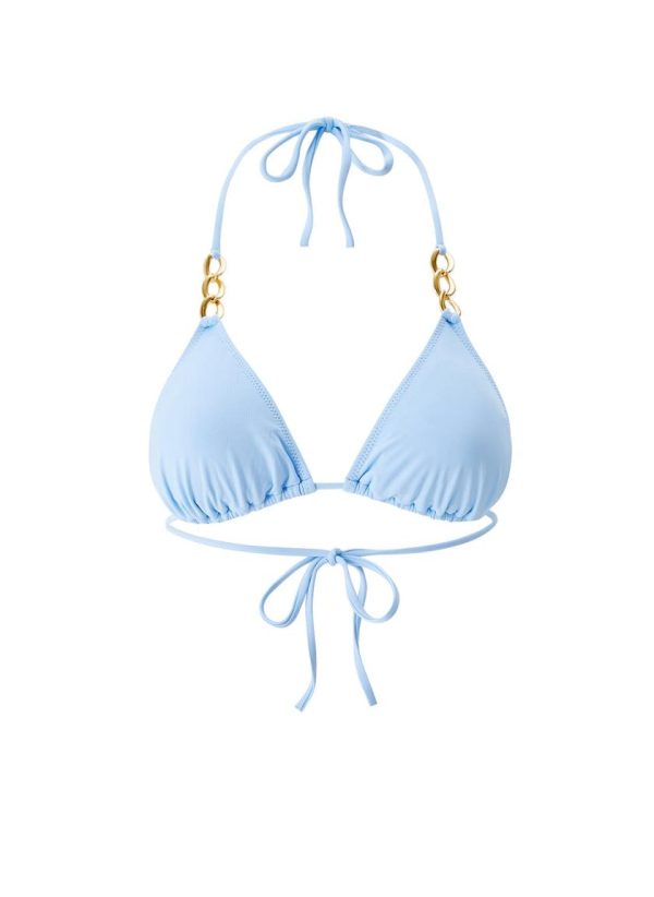 A contemporary take on a classic silhouette, opt for the Gorda Bikini Top to update your swimwear collection. In a soft, pastel shade of Dusty Blue, this style is crafted from soft, quick drying, premium swim fabric with added SPF 50+ protection. The halterneck top features triangle cups and ties at the back and nape of the neck. Large gold chain link trims provide a luxe detail, style with the Gorda Bikini Bottoms in the matching shade to complete the set.
