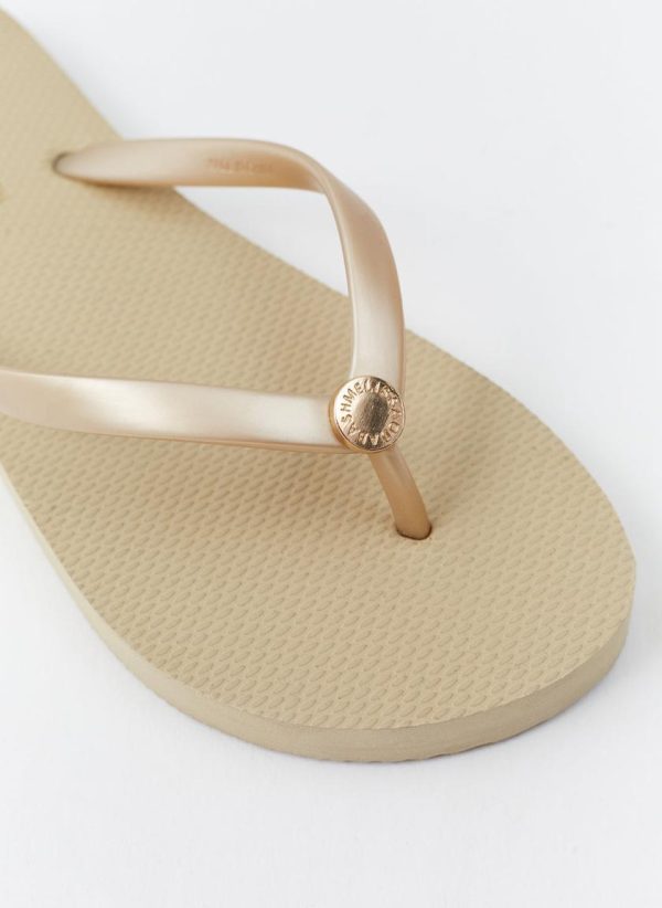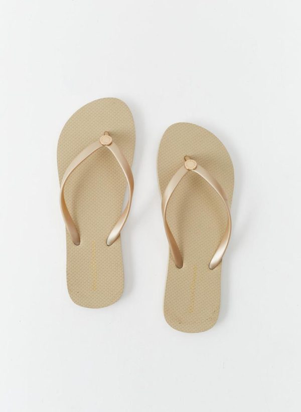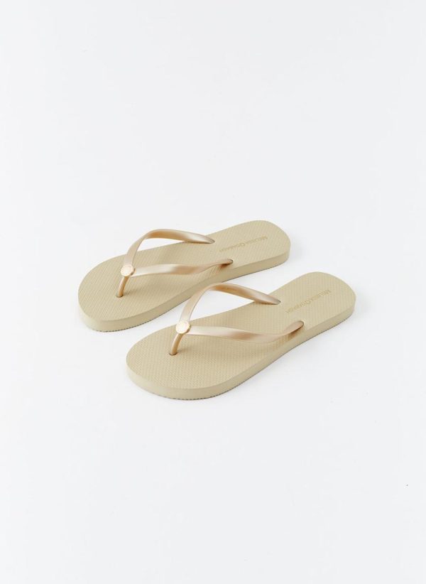 In a metallic finish with a classic flip flop silhouette, Melissa Odabash’s exclusive rubber flip flops made from light-weight materials with a comfortable fit are a must have item for vacation dressing. The Gold designer flip flops are the perfect option to take away with you for dressing with ease whether by the pool, at the beach or roaming the city, finished with branded hardware at the base of the toe post cementing their luxe appeal.