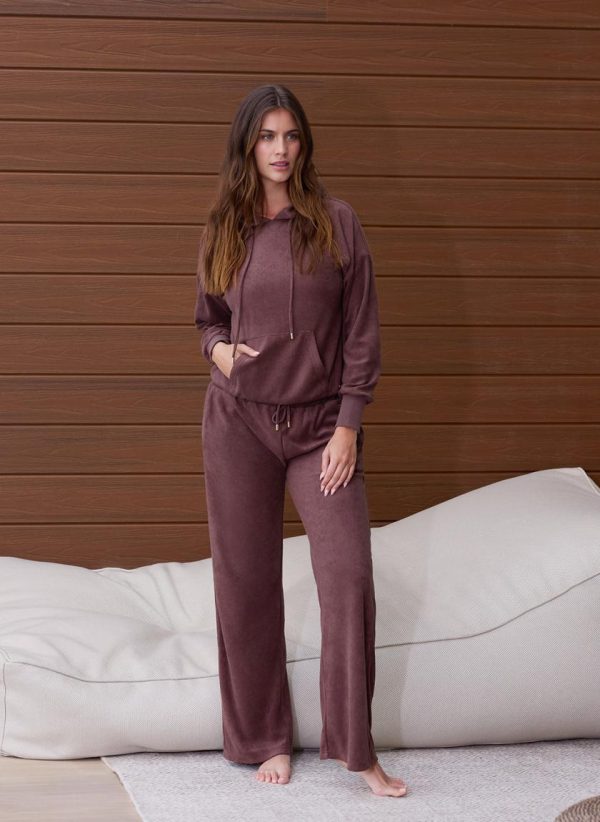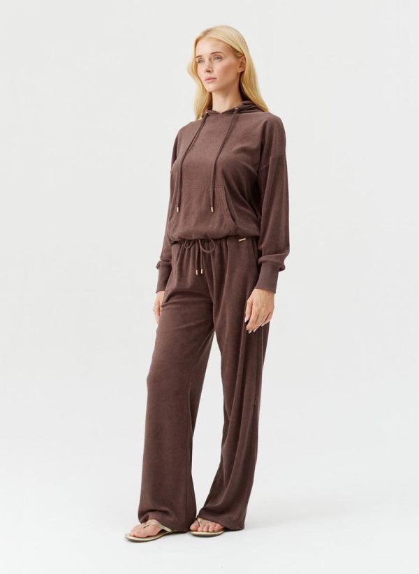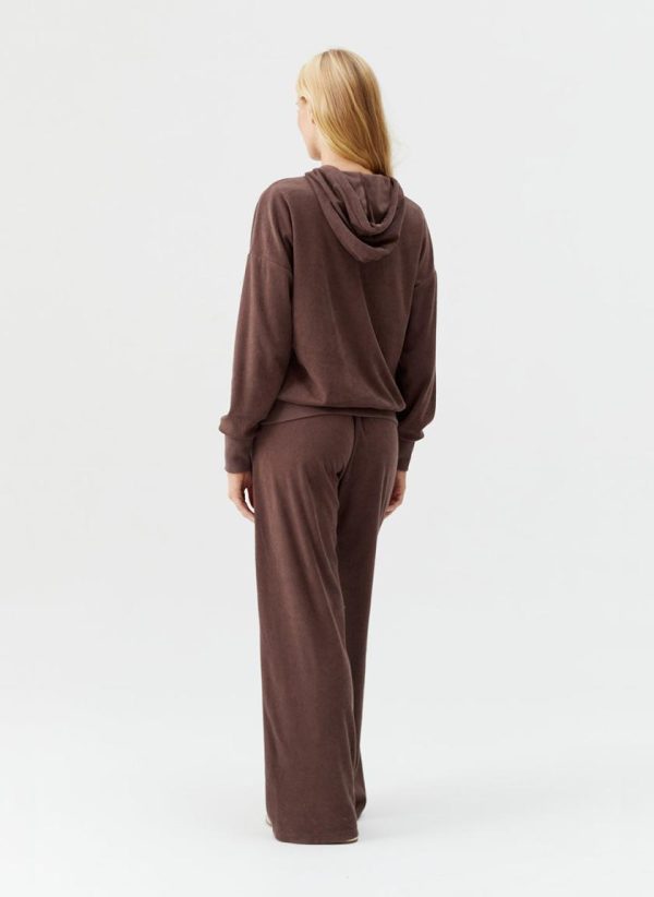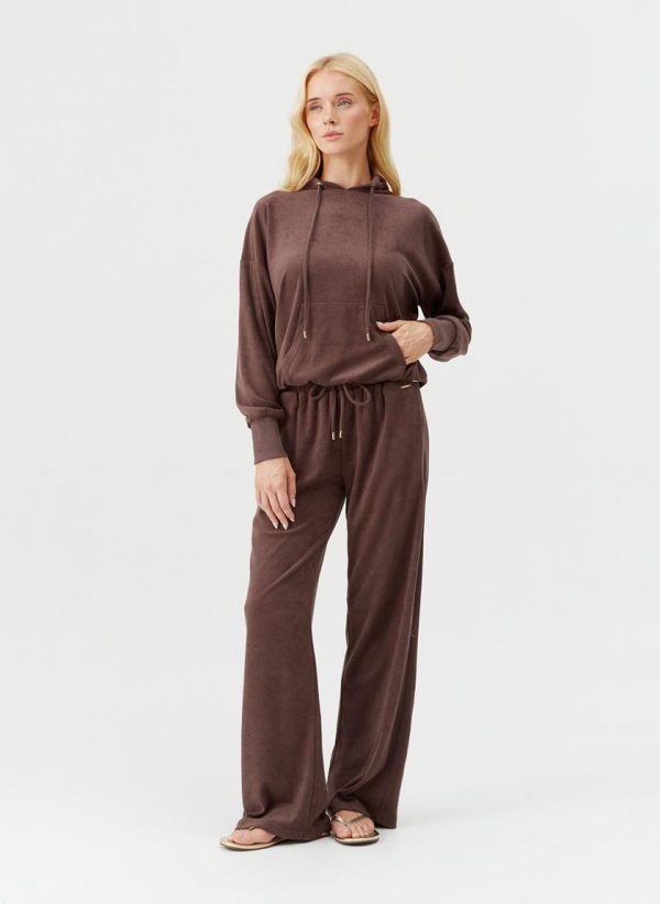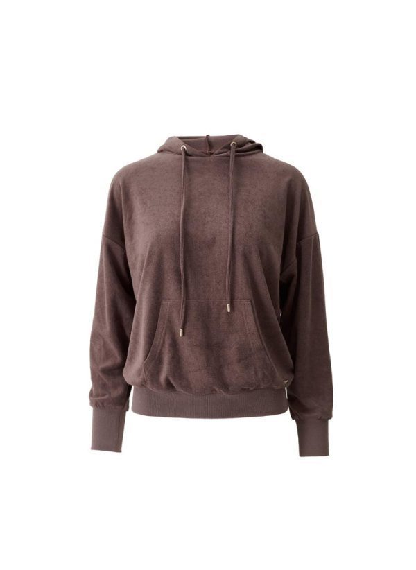 The ideal travel companion, be sure to pack the Nora Hoodie for your next getaway. In a classic Coffee hue, this relaxed piece is crafted from an ultra-soft premium terry fabric. Cut for a slouchy, laid-back fit, it boasts a large pouch pocket with elasticated hems and cuffs. Gold branded cord-ends, mirrored by a matching plaque add to its luxe appeal. Pair with the matching Betty Trousers for a coordinated finish.